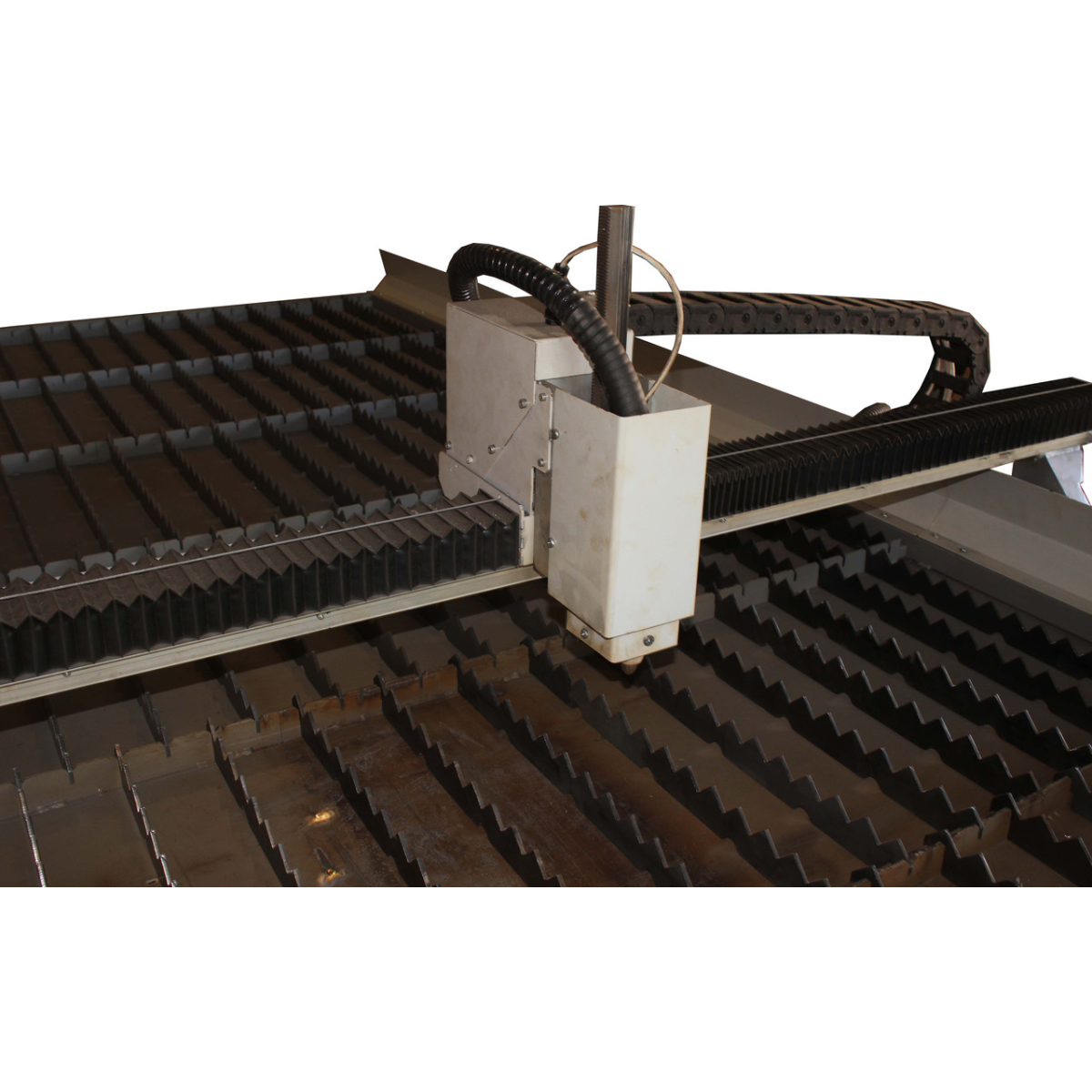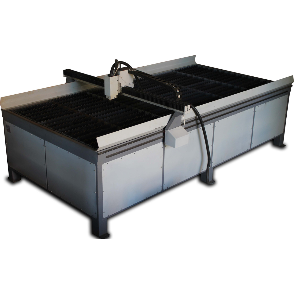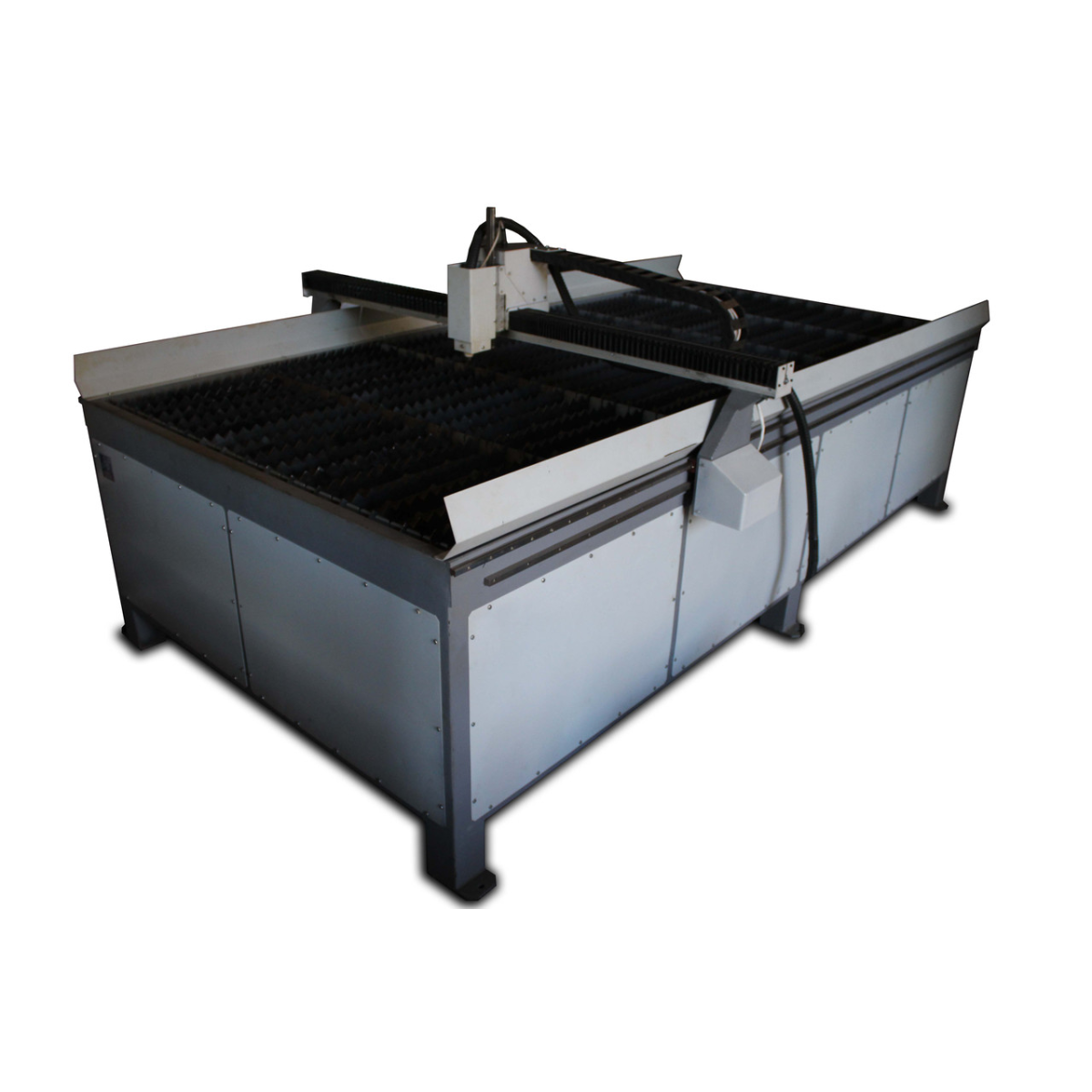 СПР — Верстат плазмового різання 15301 — Робоче поле верстата 1500х3000х100 мм. Розмір робочого поля виконується згідно з технічним завданням і впливає на вартість обладнання. СТ — Верстат виготовлений на рейковому передаванні з малим модулем, як напрямні застосовані круглі вали на опорі Верстат призначений для розкроювання металу як прямолінійного, так і фігурного. Станина верстата виготовлена зварної з товстостінної труби. Матеріал розташовується на змінних пластинах «ножах», що входять до столу. Ножі виготовлені зі смуги 40х2 і за великого вироблення їх можна без труднощів замінити. Під ножами встановлюється висувний резервуар із водою, що поглинає гар, що виділяється в процесі різання й перешкоджає його потраплянню в повітря. Особливістю ЕКО версії верстата є привод на осях «Х» і «Y» за допомогою пасової передачі та застосування як напрямних циліндричних валів на опорі по всіх осях. Допустима неперпендикулярність між осями Х і У не перевищує 1. У верстатах плазмового різання металу необхідне є застосування компенсаторів кривини металу. Встановлено пристрій, що відстежує напругу дуги й автоматично підтримує необхідну відстань від сопла до робочої поверхні. Верстат у базовій комплектації виготовлений із використанням різака CUT-60, найбільша товщина різання, яким становить 10 мм. Це джерело плазми укомплектоване ручним пальником. Установлення машинного пальника виконується за узгодженням із замовником, однак його застосування дуже рекомендується щодо суттєвого підвищення якості різання. Гарантія на джерело плазми НЕ надається. Верстат не комплектується комп“ютером і компресором, необхідними для роботи. Комп“ютер надає замовник. Обов“язковим для нормального підпалу дуги є застосування фільтрів, що осушують повітря, що виходить із компресора. На наданий комп“ютер встановлюються демонстраційні версії програмного забезпечення, ліцензії до яких замовник набуває за власним бажанням. Навчання роботи на верстаті та базовим знанням за написанням програм керування, що виконуються на території виробника, є безплатним і обов“язковим. Термін виготовлення залежить від завантаження виробництва та коливається від 4 до 6 тижнів.