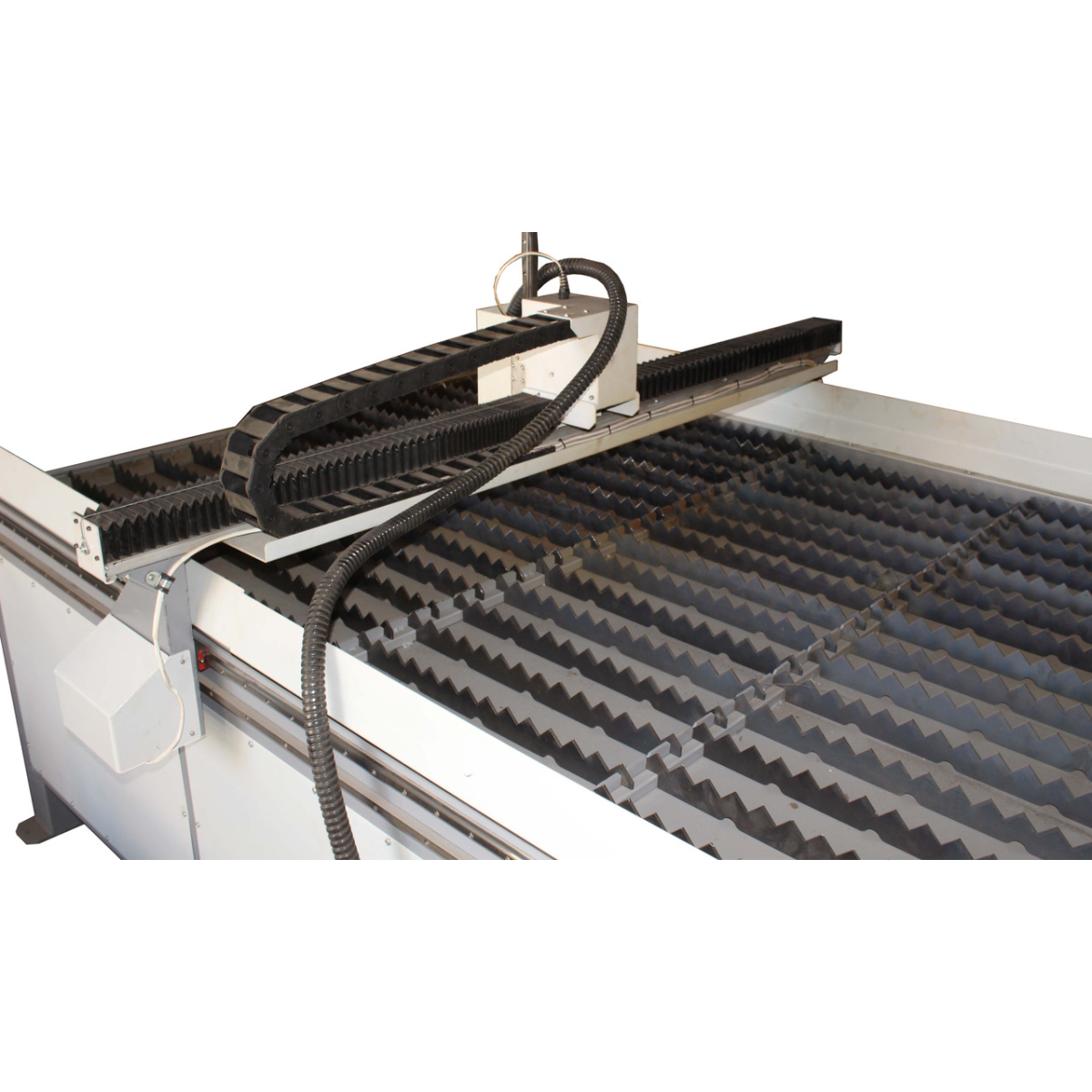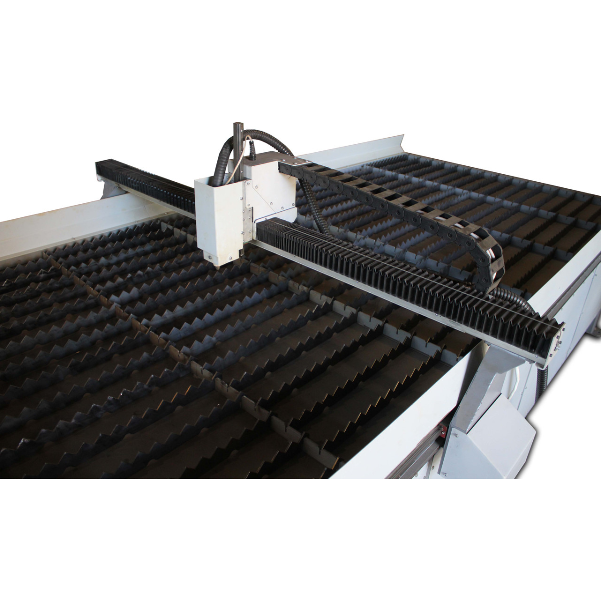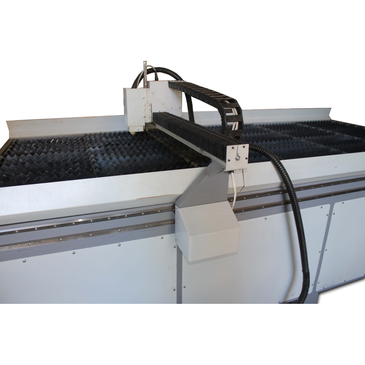 СПР — Верстат плазмового різання 15301 — Робоче поле верстата 1500х3000х100 мм. Розмір робочого поля виконується згідно з технічним завданням і впливає на вартість обладнання. СТ — Верстат виготовлений на рейковому передаванні з малим модулем, як напрямні застосовані круглі вали на опорі Верстат призначений для розкроювання металу як прямолінійного, так і фігурного. Станина верстата виготовлена зварної з товстостінної труби. Матеріал розташовується на змінних пластинах «ножах», що входять до столу. Ножі виготовлені зі смуги 40х2 і за великого вироблення їх можна без труднощів замінити. Під ножами встановлюється висувний резервуар із водою, що поглинає гар, що виділяється в процесі різання й перешкоджає його потраплянню в повітря. Особливістю ЕКО версії верстата є привод на осях «Х» і «Y» за допомогою пасової передачі та застосування як напрямних циліндричних валів на опорі по всіх осях. Допустима неперпендикулярність між осями Х і У не перевищує 1. У верстатах плазмового різання металу необхідне є застосування компенсаторів кривини металу. Встановлено пристрій, що відстежує напругу дуги й автоматично підтримує необхідну відстань від сопла до робочої поверхні. Верстат у базовій комплектації виготовлений із використанням різака CUT-60, найбільша товщина різання, яким становить 10 мм. Це джерело плазми укомплектоване ручним пальником. Установлення машинного пальника виконується за узгодженням із замовником, однак його застосування дуже рекомендується щодо суттєвого підвищення якості різання. Гарантія на джерело плазми НЕ надається. Верстат не комплектується комп“ютером і компресором, необхідними для роботи. Комп“ютер надає замовник. Обов“язковим для нормального підпалу дуги є застосування фільтрів, що осушують повітря, що виходить із компресора. На наданий комп“ютер встановлюються демонстраційні версії програмного забезпечення, ліцензії до яких замовник набуває за власним бажанням. Навчання роботи на верстаті та базовим знанням за написанням програм керування, що виконуються на території виробника, є безплатним і обов“язковим. Термін виготовлення залежить від завантаження виробництва та коливається від 4 до 6 тижнів.