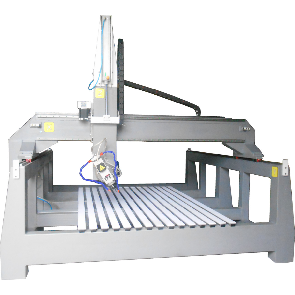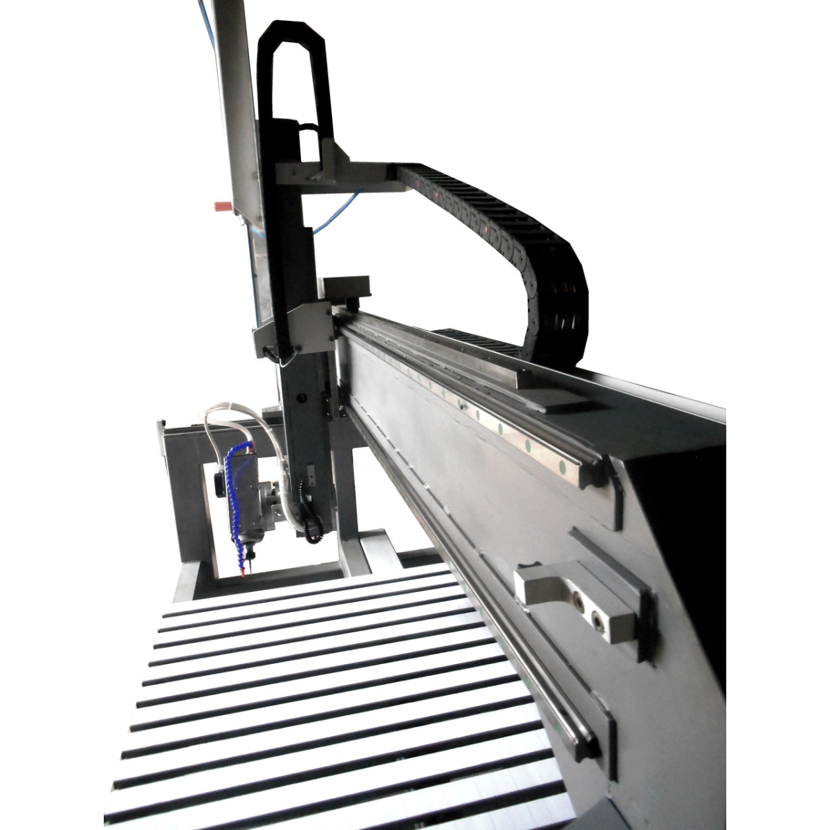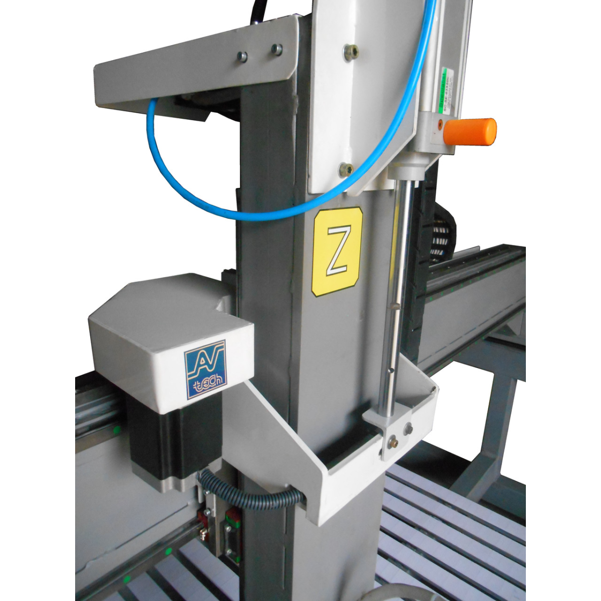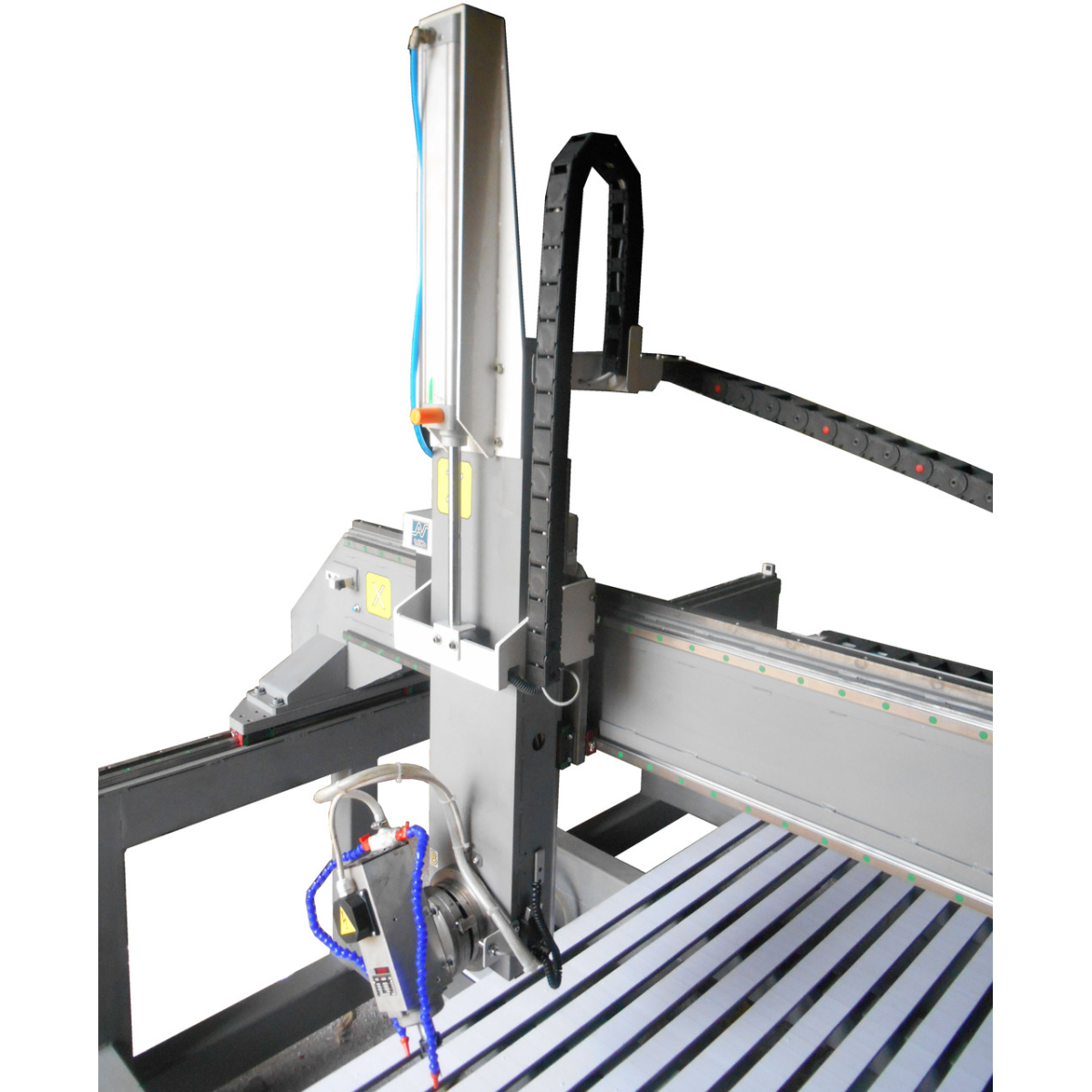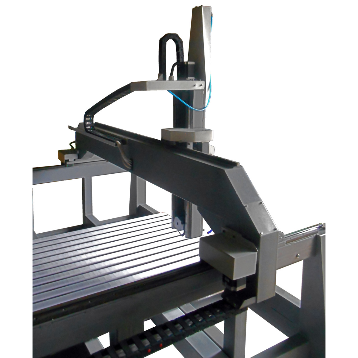 Чотири-координатний фрезерний верстат із числовим програмним керуванням (ЧПУ) дає змогу фрезерувати деталі із пластиків, МДФ, деревини різних порід, пінопласту; однаково просто справляється з об“ємною різзю на дереві та криволінійному розкроєнні матеріалів, а також із фрезеруванням виробів для яких необхідний нахил шпинделя Щодо осі Z. Станина виготовлена з товстостінної профільної труби, після чого оброблена фрезеруванням. Основною особливістю верстата є наявність поворотного шпинделя. Нахил шпинделя відносно вертикального розташування здійснюється за допомогою крокового двигуна, що приводить у рух хвилястий безлюфтовий редуктор, на якому й закріплений шпиндель. Верстат має досить високий портал, тому конструкція осі Z зроблена жорсткішою, ніж у трьох координатних верстатах. Це дає змогу забезпечити максимальну жорсткість шпиндельної пластини в будь-якій точці фрезерування.