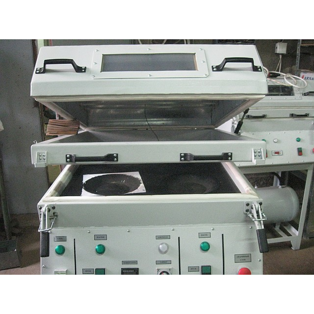 Застосовується для термопереносу зображення на рельєфні деталі, склеювання виробів під тиском, облицювання фасадів і формування пластиків завтовшки до 3 мм. Термосублімаційний 3D принтер, далі «Оборудатування», застосовується для термопереносу зображення, надрукованого за допомогою сублімаційного чорнила на спеціальному папері, на всілякі поверхні, що мають складний рельєф, як-от пластикові панелі телефонів, посуд, метал, фляги, фотокамні тощо. Обладнання виготовлене зварним, складається з вакуумної зони. Притискної рамки та нагрівальної камери. Як ущільнювач вакуумної зони використовується силіконовий профіль. Застосовуються високоякісні елементи автоматики фірм Autonics і Lovato. Рівень розрідження контролюється за допомогою електроконтактного вакуумометра. Габаритні розміри обладнання 700х700х1300, без урахування опор, маса становить 90 кг. Матеріал столу — алюміній, матеріал мембрани — термостійкий силікон (2 мм). Робоча температура та тривалість процесу задається оператором. Потужність нагрівальних елементів (інфрачервоні лампи) і вакуумного насоса не перевищує 3 кВт, що дає змогу використовувати обладнання в домашніх умовах. Рівень розрідження, створюваного насосом, становить 0,85 атм., продуктивність 5 куб. м. в час. В середньому термін виготовлення обладнання становить 4 тижні, однак залежить від поточної завантаженості виробництва. Гарантія на обладнання становить 1 рік з дня його відвантаження. * - Навчання базових навичок роботи з пресом здійснюється на території виробника та входить до його вартості. * - Доставка обладнання здійснюється силами покупця, можлива допомога в організації * - форма оплати: 50% — аванс, 50% — перед відвантаженням