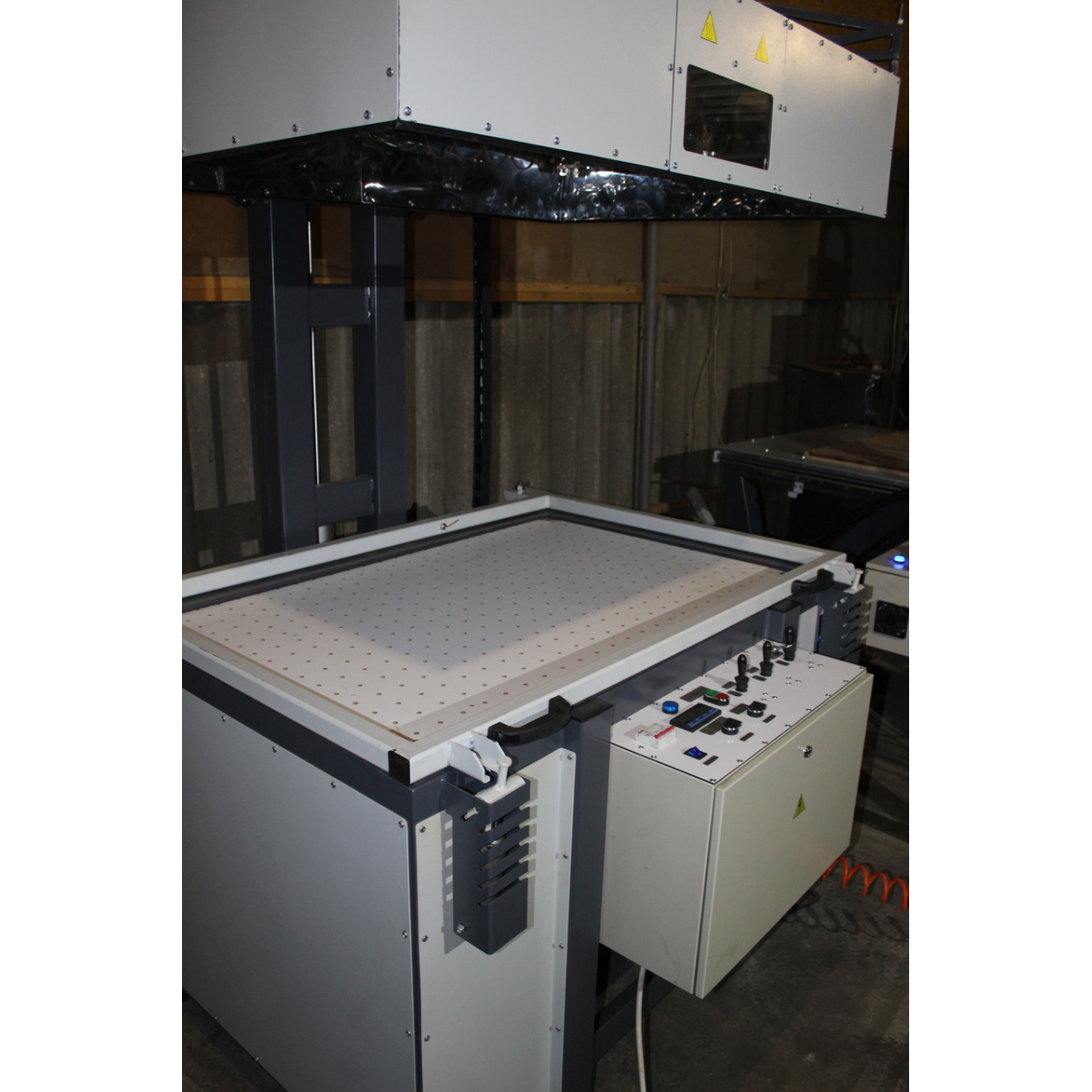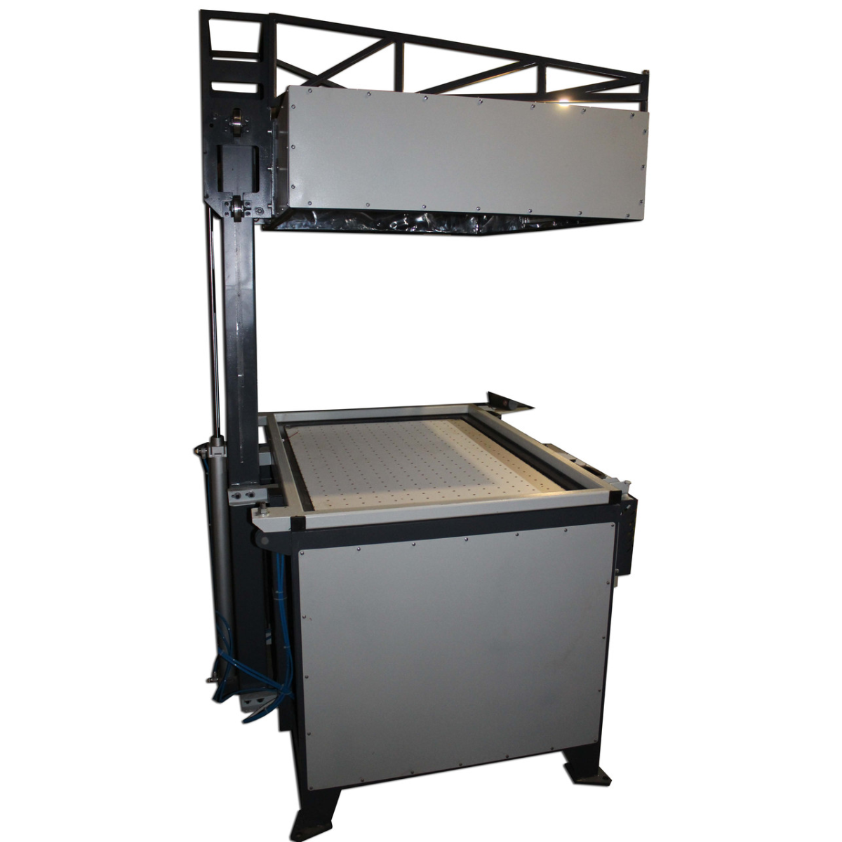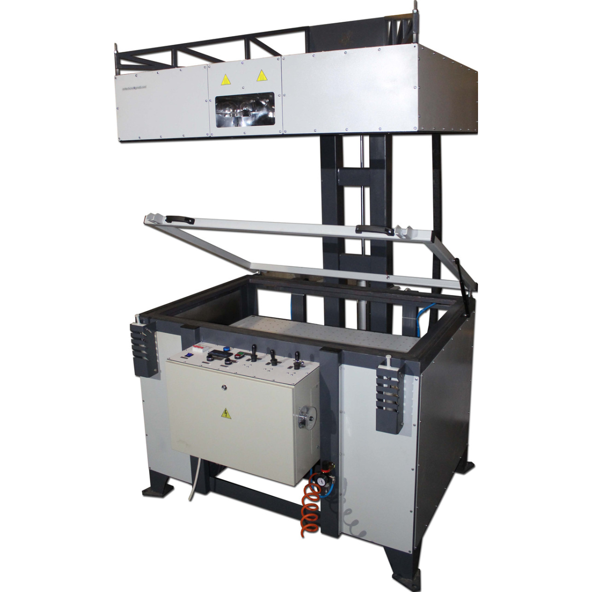 Як нагрівальні елементи застосовуються інфрачервоні лампи. Внутрішня поверхня нагрівальної камери обшита неіржавким полірованим листом, що забезпечує Підіймання нагрівальної камери, потужність якої становить 10 кВт також підіймається за допомогою пневматичних циліндрів. Фіксація притискної рамки здійснюється вручну, за допомогою механічних притискачів.