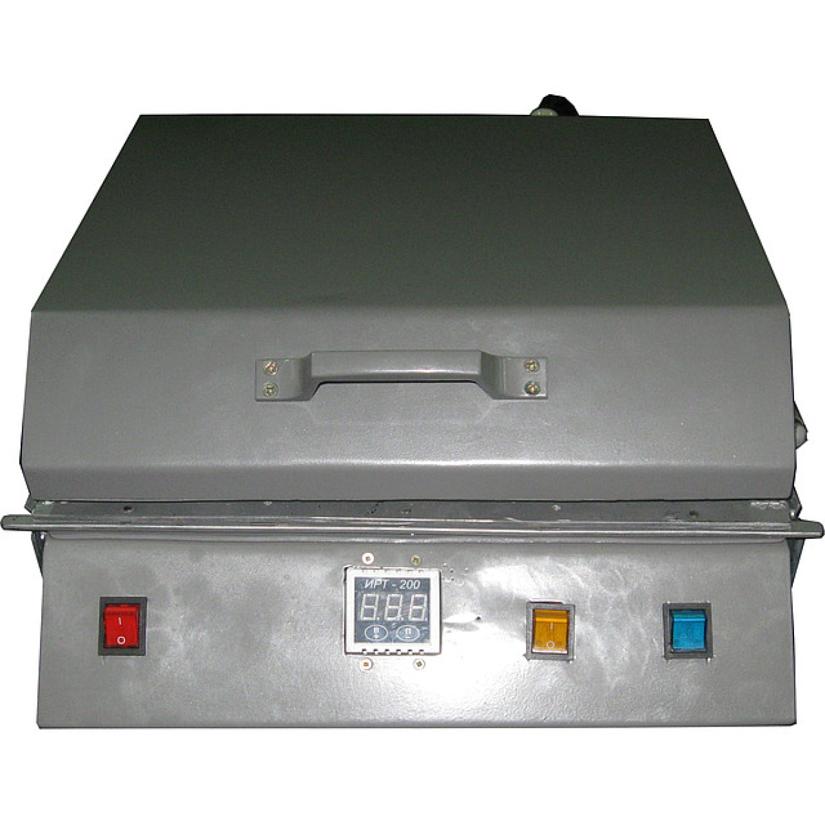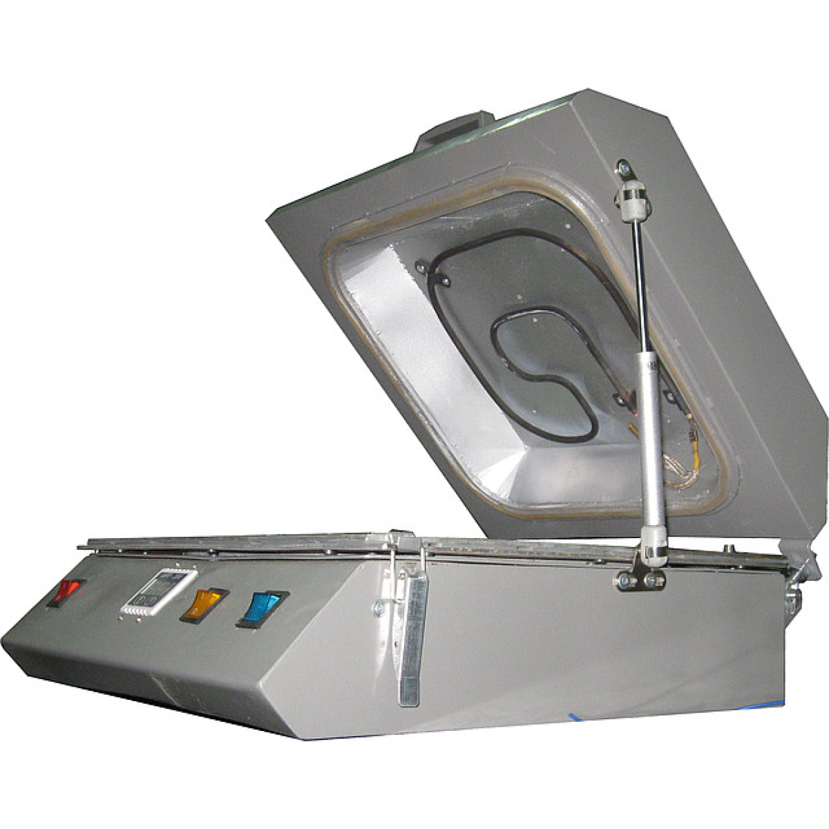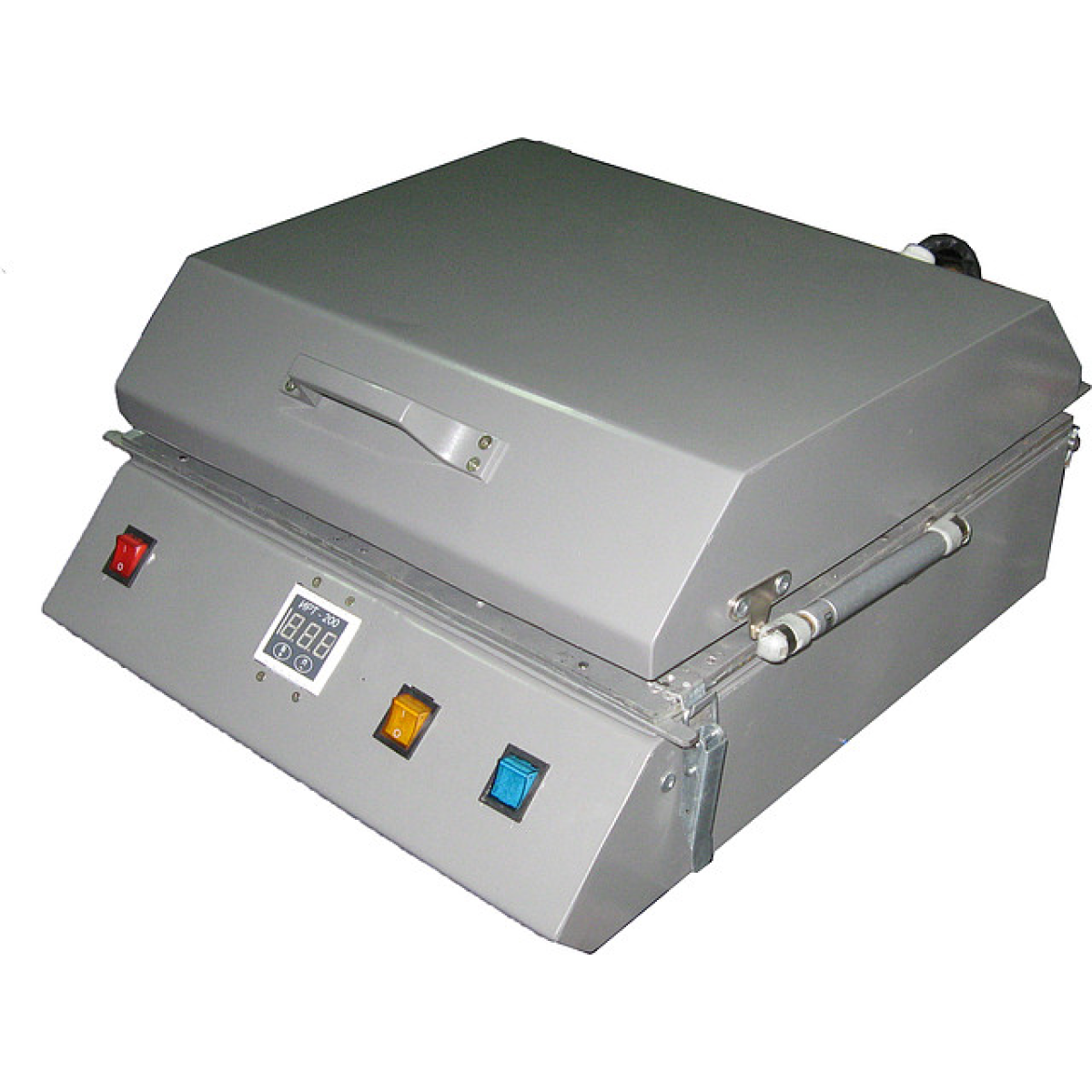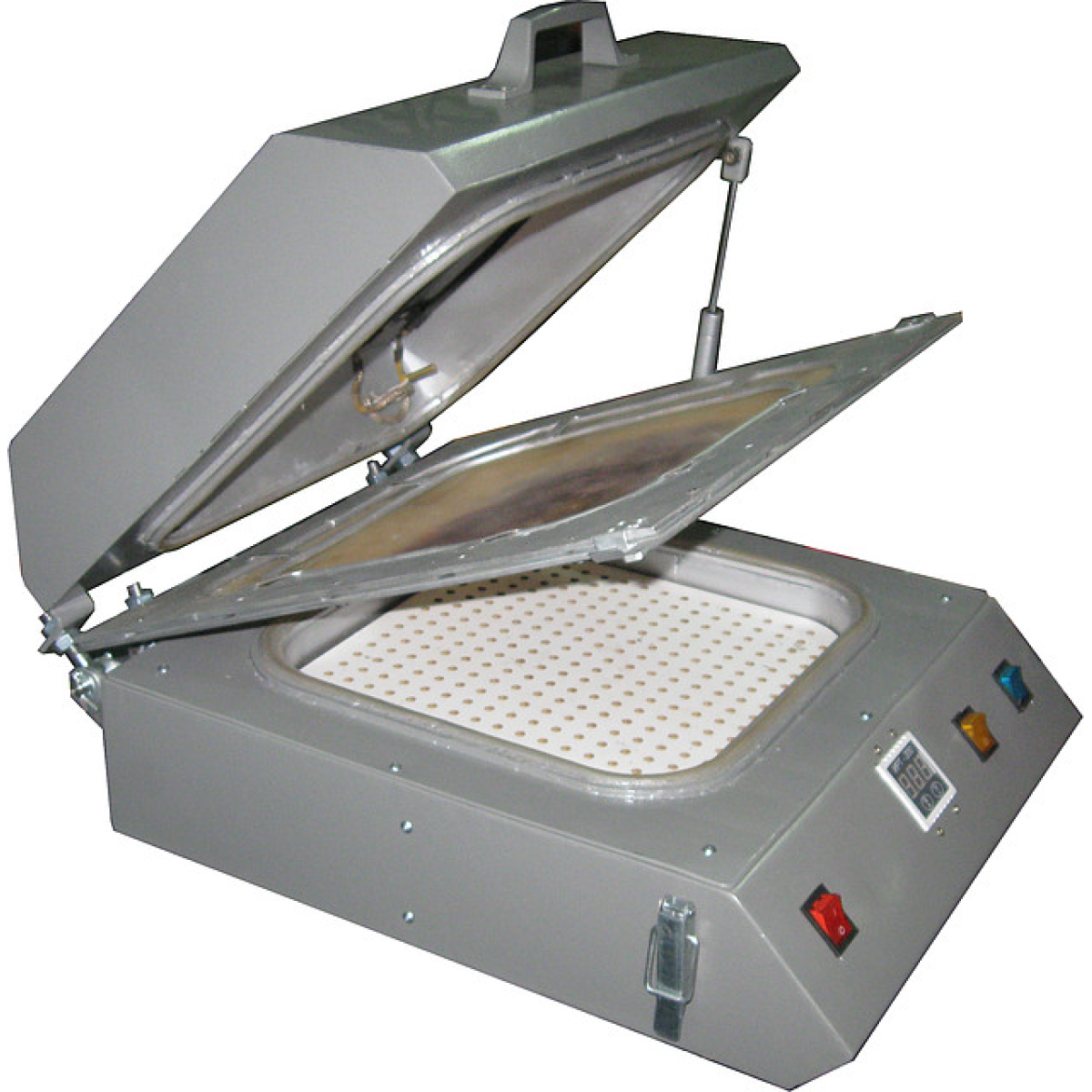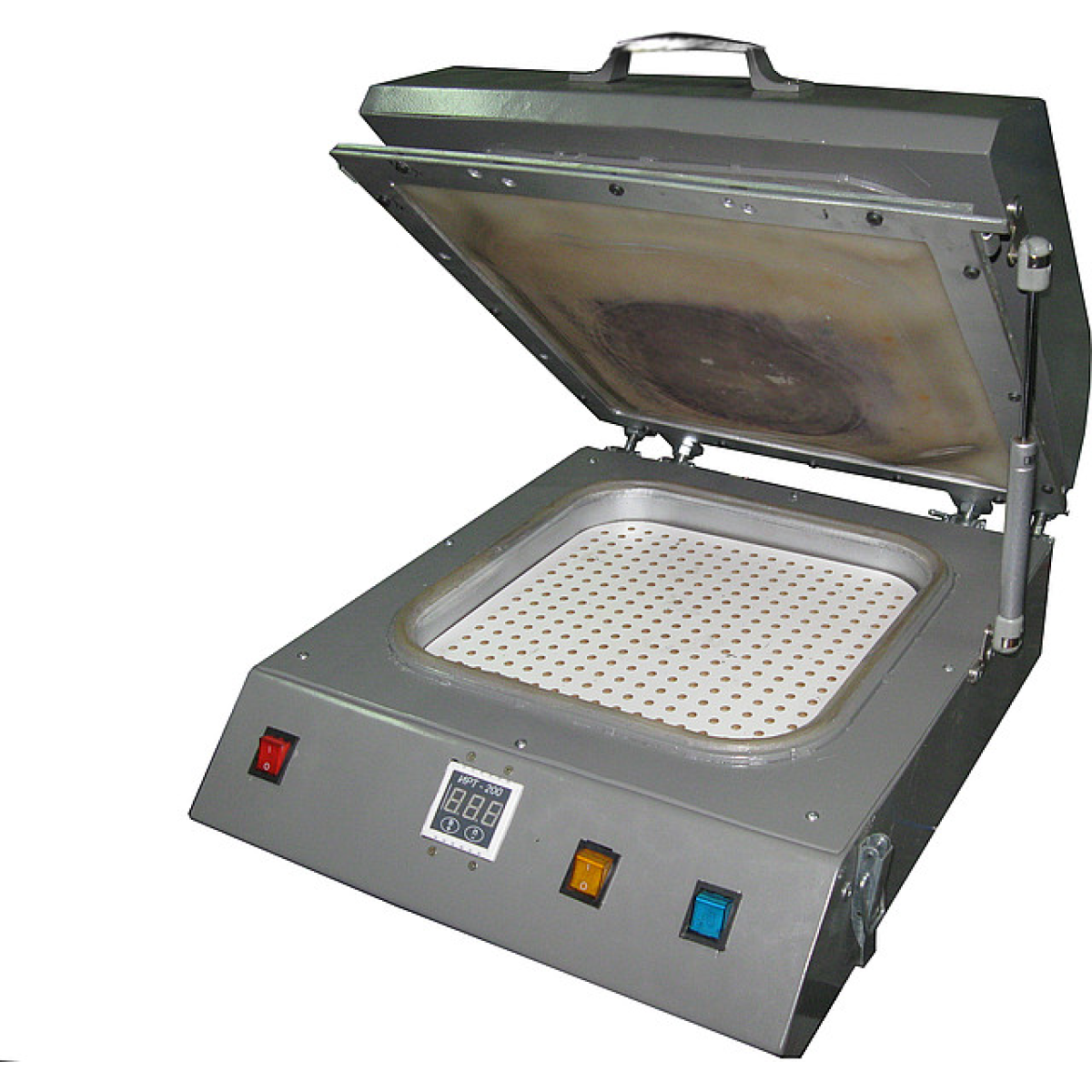 Встановлення для термопереносу зображень на поверхні різних виробів Сублімаційний 3D принтер призначений для термопереносу зображень на різні поверхні, як плоскі, так і об“ємні. Пристрій складається з нагрівальної камери, притискної рамки. у якій зафіксована мембрана та основа, у якому розташована вакуумна зона пристрою й елементи керування. Як нагрівальний елемент використаний гнучкий ТЕН, потужністю 1 кВт. Температура контролюється за допомогою термопари, розташованої в нагрівальній камері. На передній панелі розташовані такі елементи керування: кнопка живлення, кнопка вмикання нагрівання, кнопка подавання вакууму, що дає змогутравлювати вакуум із-під мембрани за допомогою електроклапана. Температура нагрівання задається за допомогою терморегулятора. Рівень вакууму підтримується автоматично та встановлюється виробником обладнання. По суті, цей пристрій являє собою мембранно-вакуумний прес. Завдяки малим габаритам і невеликій споживаній потужності цей пристрій може бути використаний в умовах звичайної квартири. За допомогою цього пристрою можна переносити зображення на тарілки, кухлі, плоскі поверхні, наприклад, алюмінієві, плитку, фляги тощо. Можливе надсилання обладнання в будь-яку точку України за допомогою транспортної компанії. Вартість транспортування не входить у вартість обладнання.
