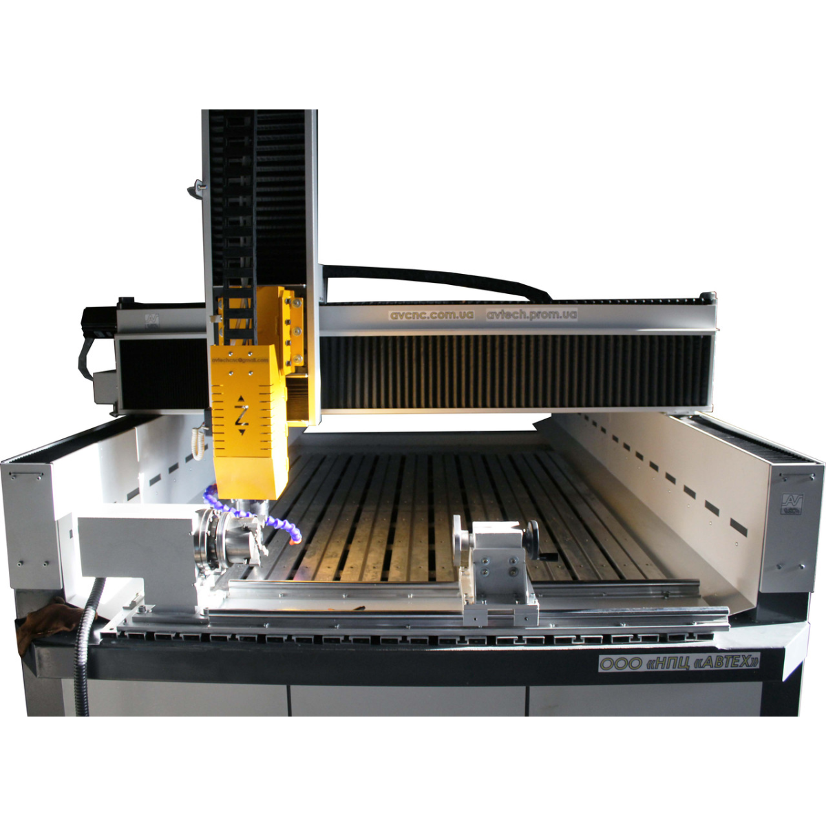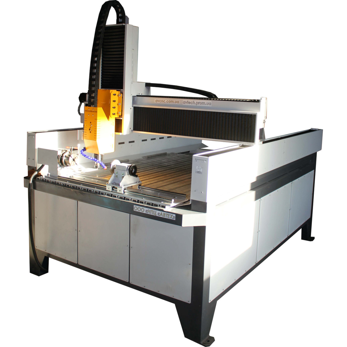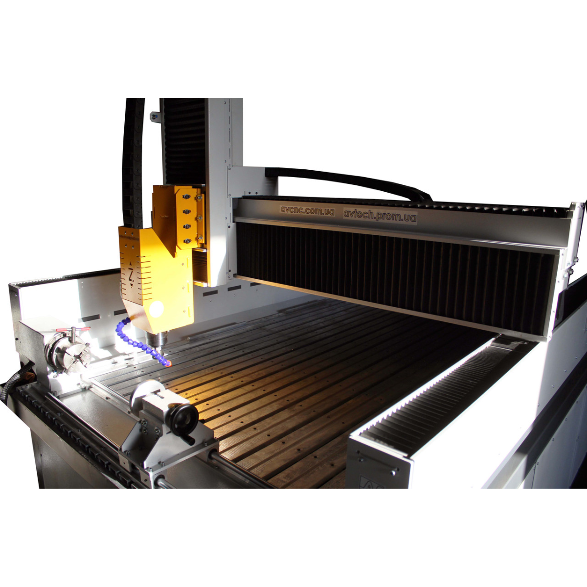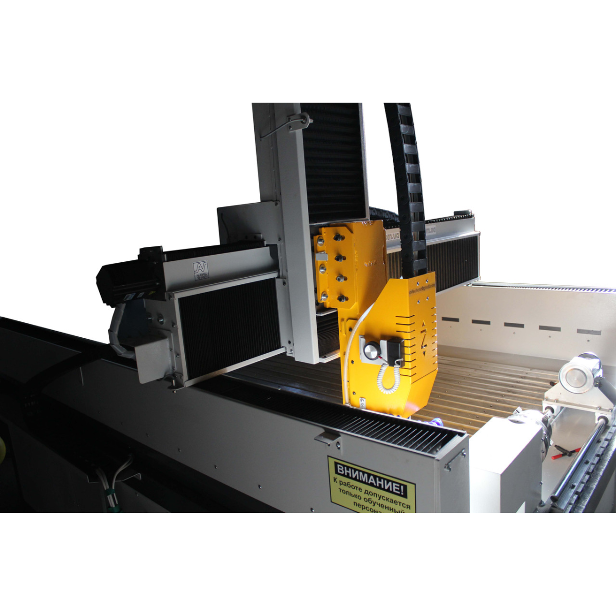 Цей деревообробний фрезерний верстат із числовим програмним керуванням (ЧПУ) дає змогу з високою точністю фрезерувати деталі із пластиків, МДФ, деревини різних порід. Верстат однаково просто справляється з об“ємною різзю на дереві та криволінійним розкроємом матеріалів. Заготівка тримається на столі за допомогою механічних притискачів. Розташування притискачів визначається залежно від вимог замовника. Станина верстата виготовлена з товстостінної профільної труби, після чого оброблена струганням для досягнення найбільшої, можливої, точності роботи верстата. Гвинти за осями Х і У натягнуті для зменшення рівня коливань. Можлива комплектація верстата поворотним пристроєм, який можна під“єднати як замість однієї з координат, так і як додаткова координати.